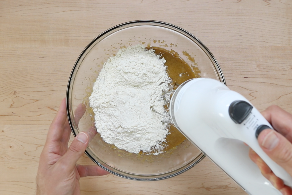 8. Gradually add the flour mixture to the wet ingredients, mixing on low speed until just combined.