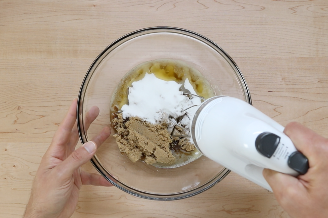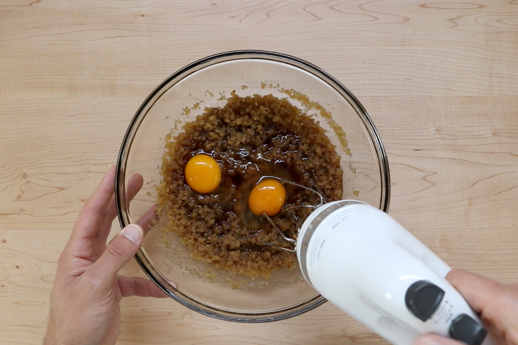 7. Add the eggs and vanilla and mix until the batter is smooth and well combined.