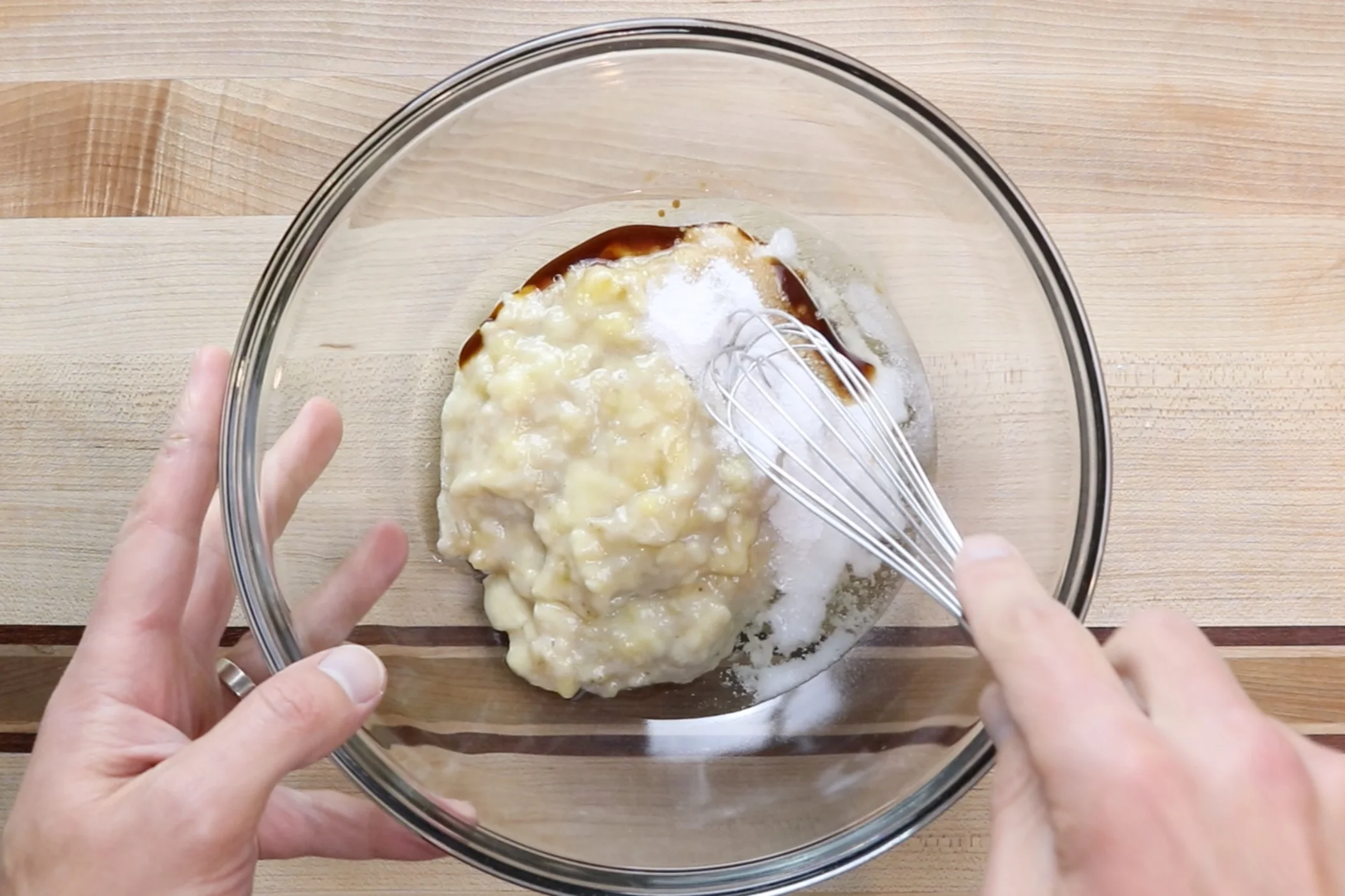 3. In a medium bowl, add the banana, coconut oil, vanilla and Stevia. Whisk until combined.