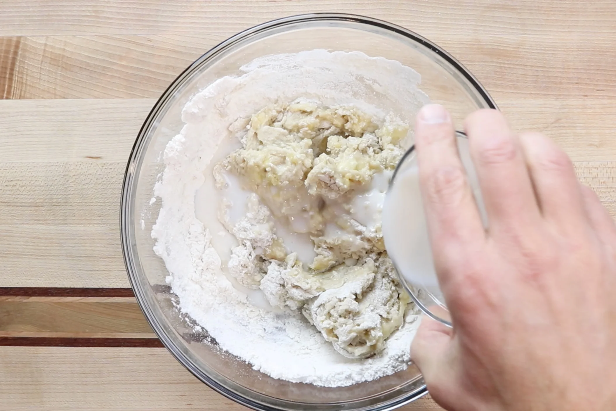 - Add half of the flour mixture and stir together with a spatula. Add half of the almond milk and continue folding together. Repeat the steps and fold the mixture until all the flour mixture is part of the dough ball.