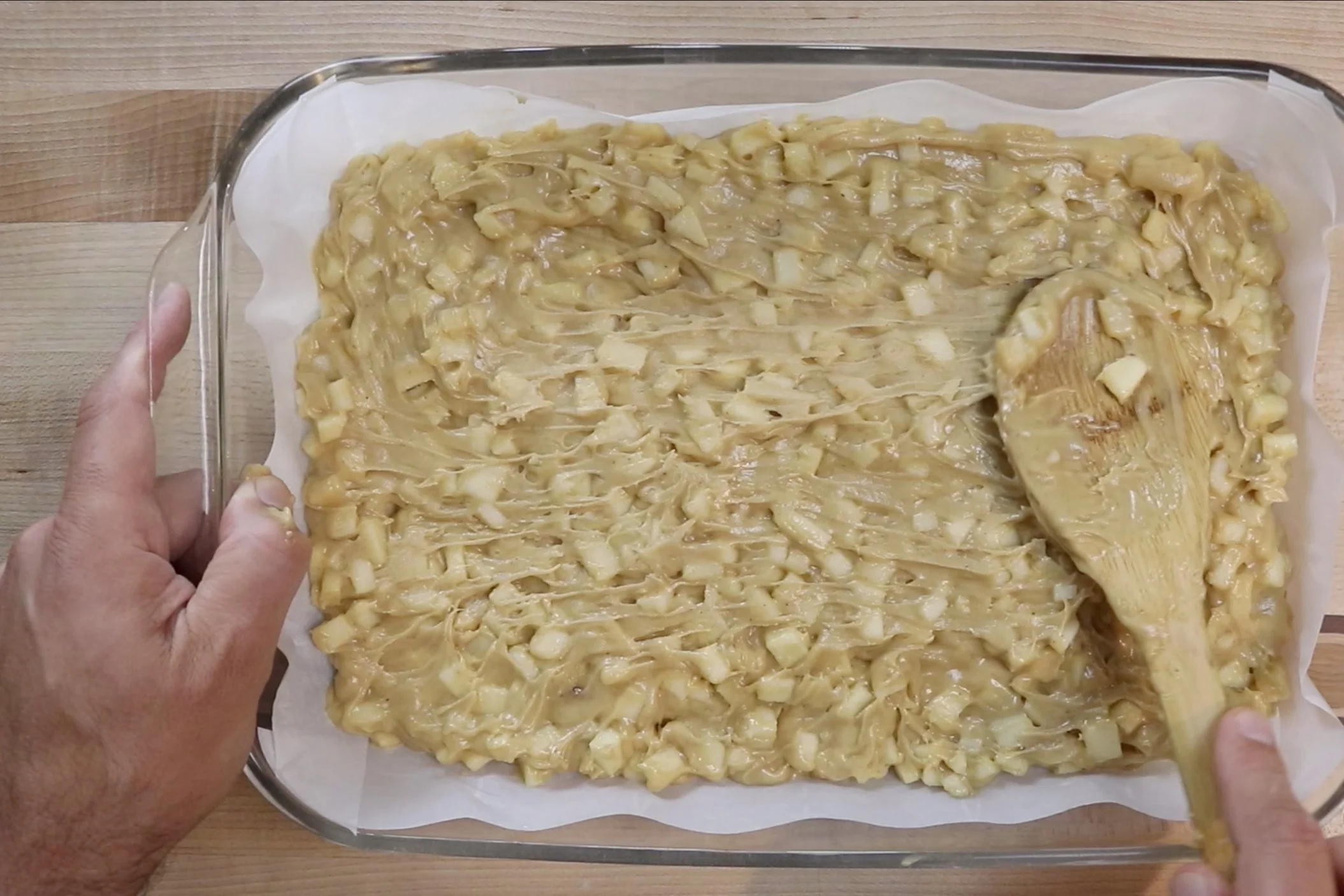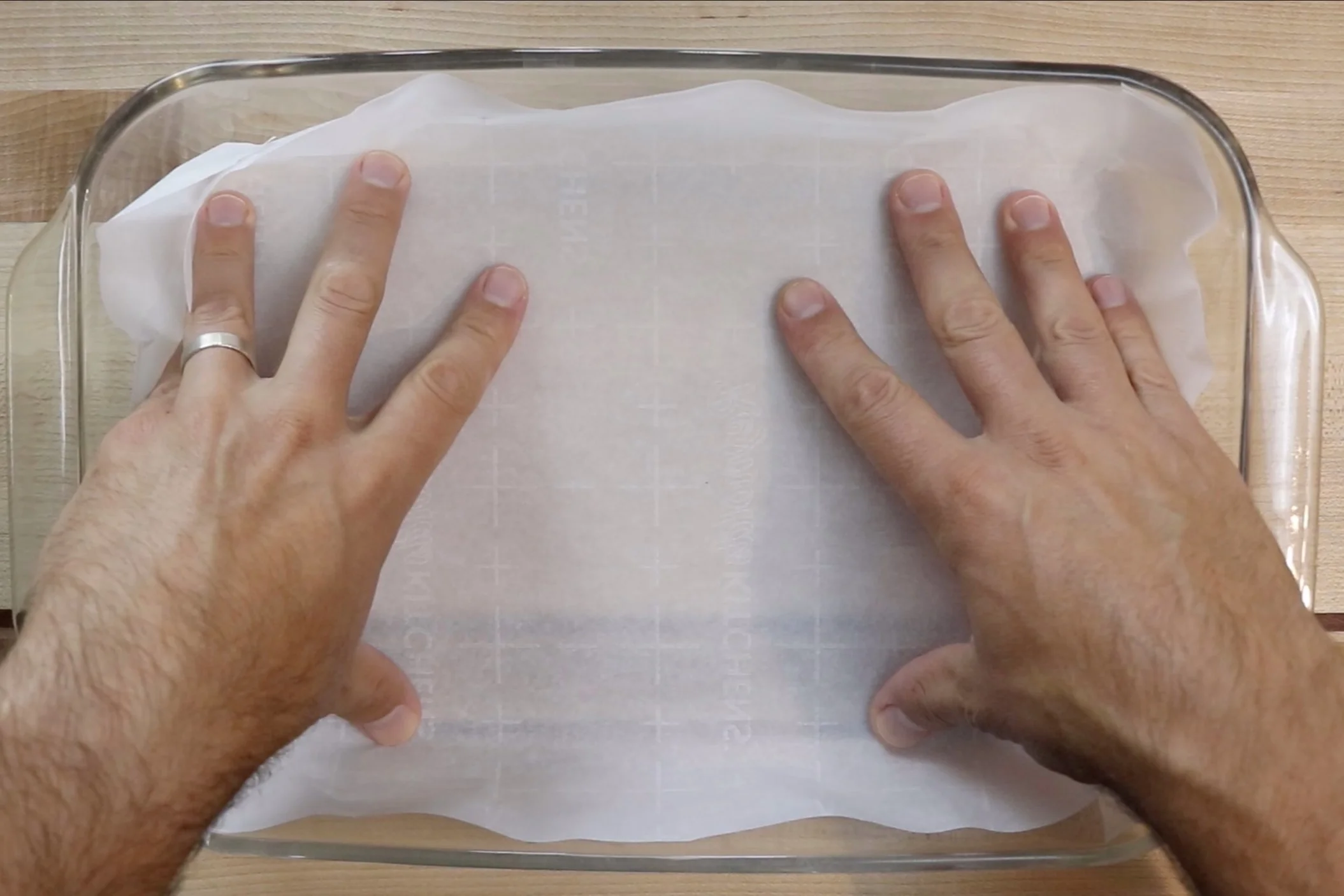 - Preheat oven to 350 degrees and line a 9x13 inch glass baking dish with parchment paper and spray with baking spray. Set aside.