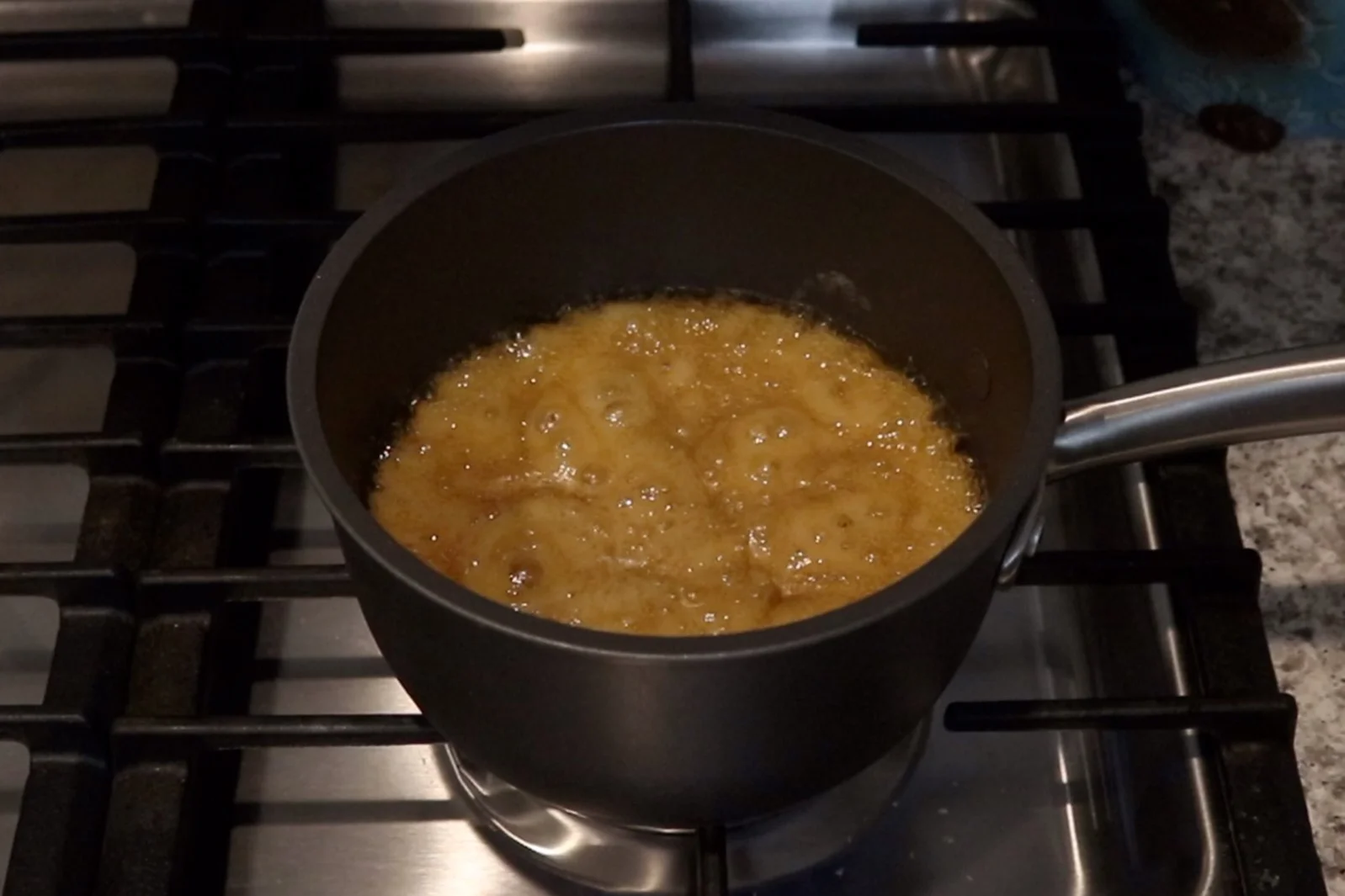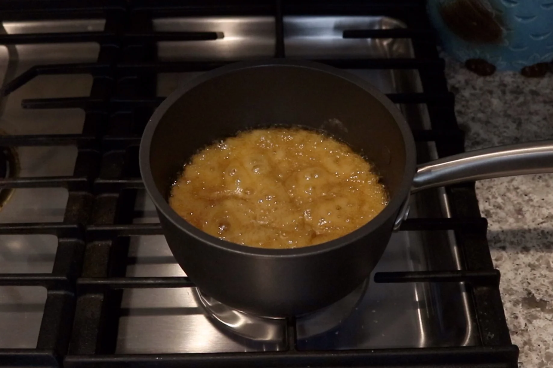 - Remove from heat and add baking soda. Glaze will bubble rapidly. Stir until it turns to a lighter brown color.