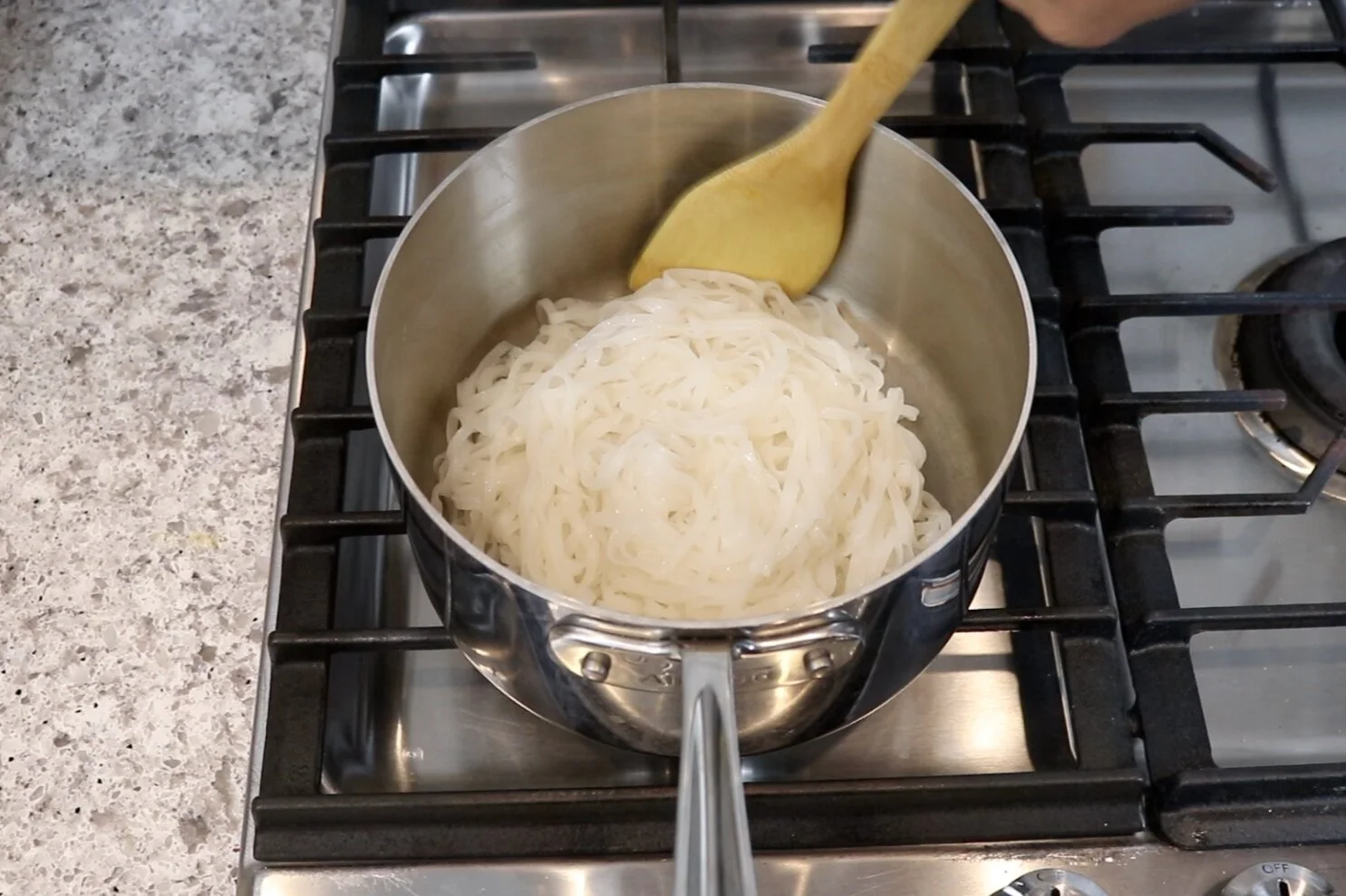 7. Cook the rice noodles for 3 minutes in the boiling water.