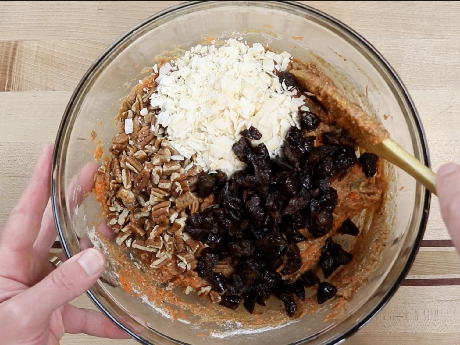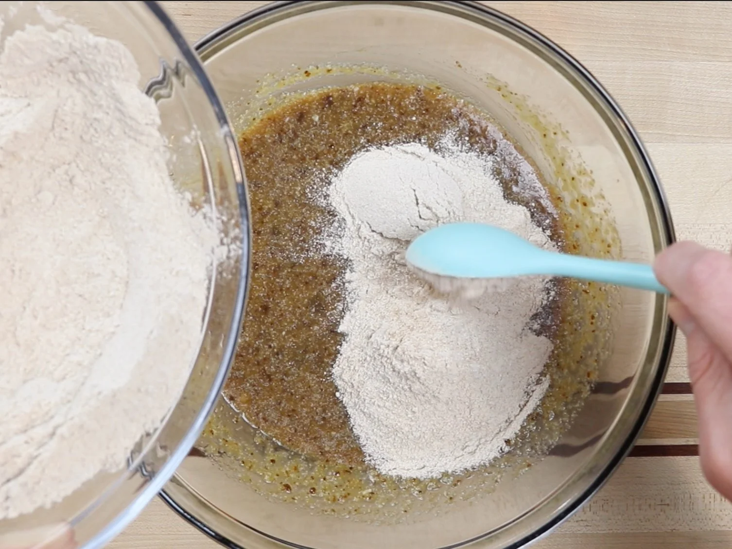 5. Add the flour mixture to the wet ingredients and stir together with a wooden spoon or spatula.
