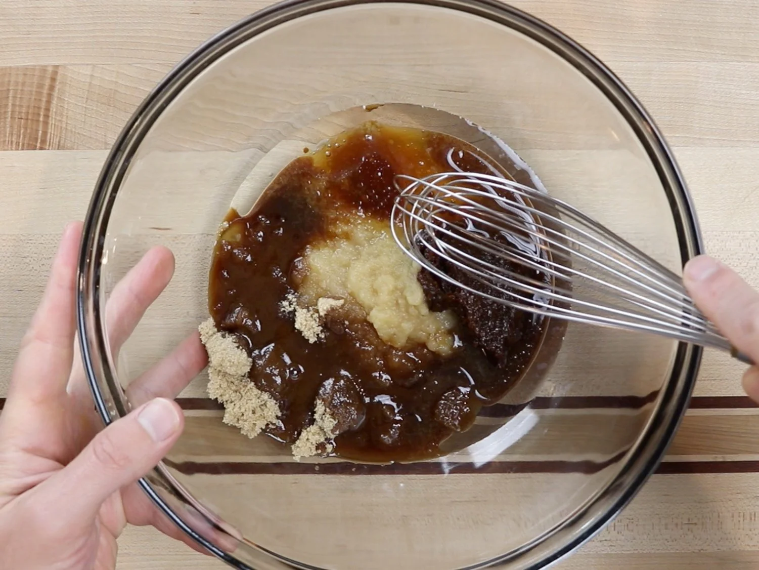 3. In a large bowl add the coconut oil, prune puree, applesauce, brown sugar, honey, and prune juice. Whisk together until incorporated.