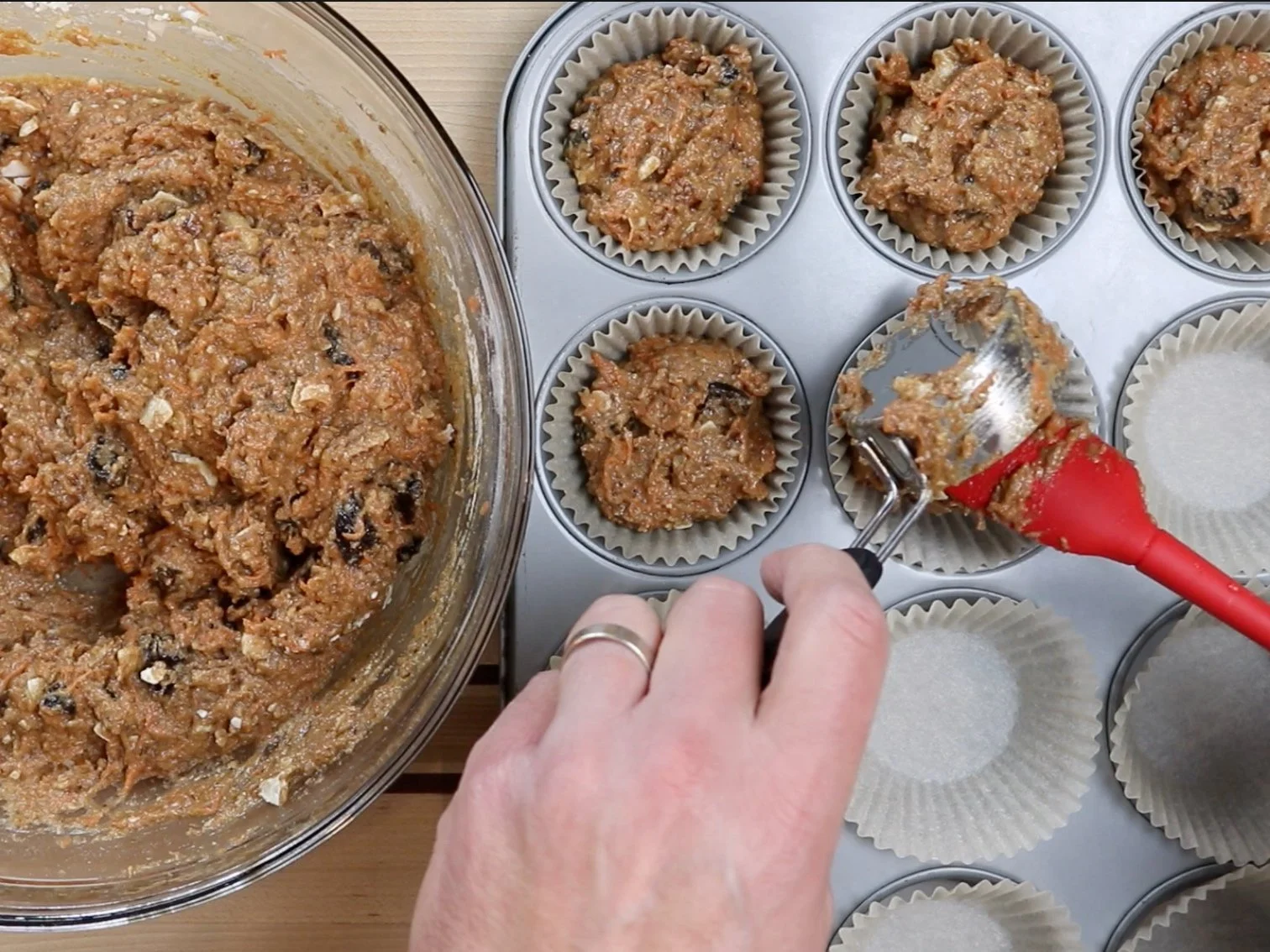 8. Fill the muffin cups 3/4 full. Using a 1/4 cup measuring cup works well for this.
