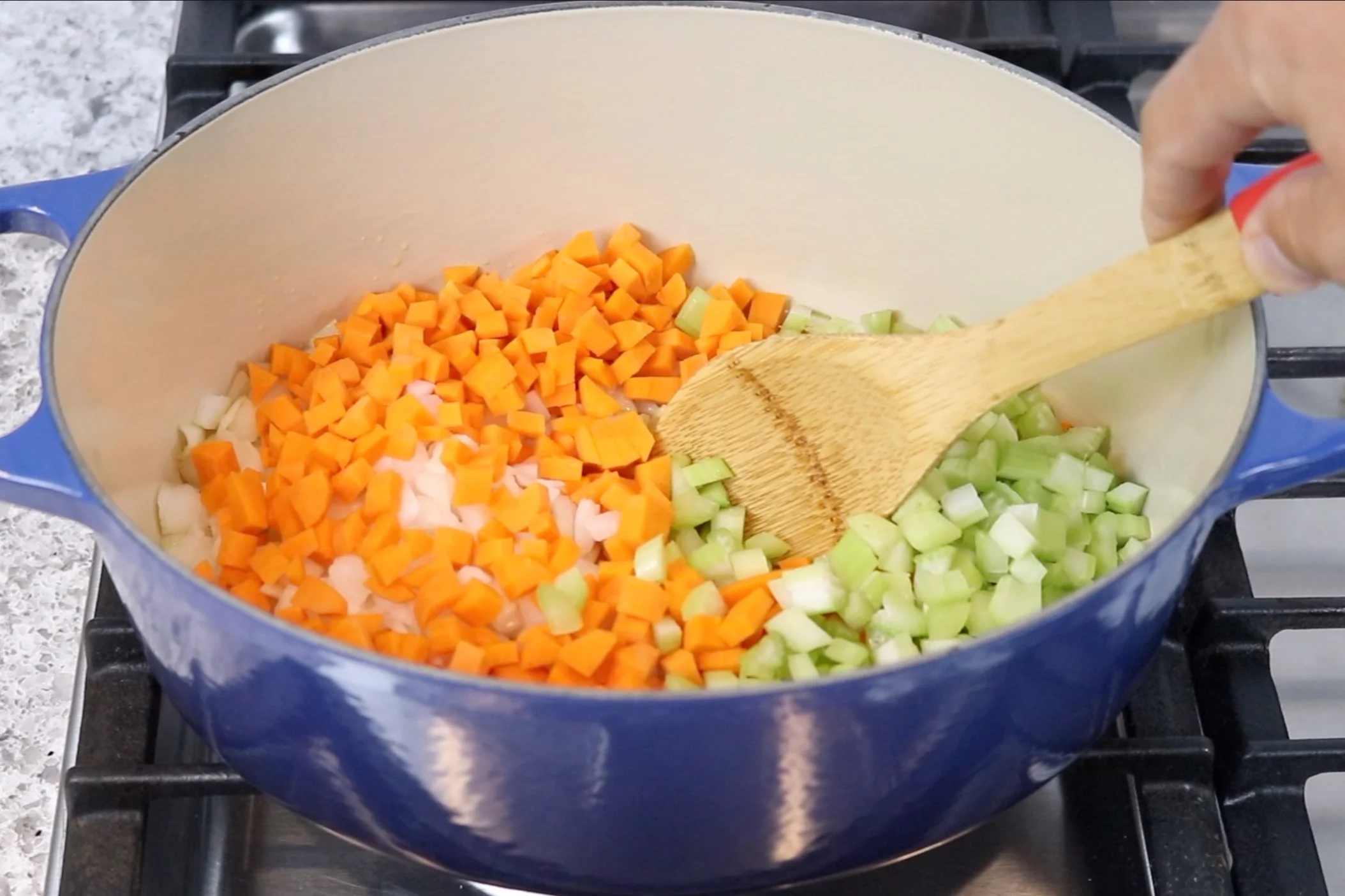 - Add the garlic, onion, carrots and celery. Sauté for 8-10 minutes until veggies are tender.