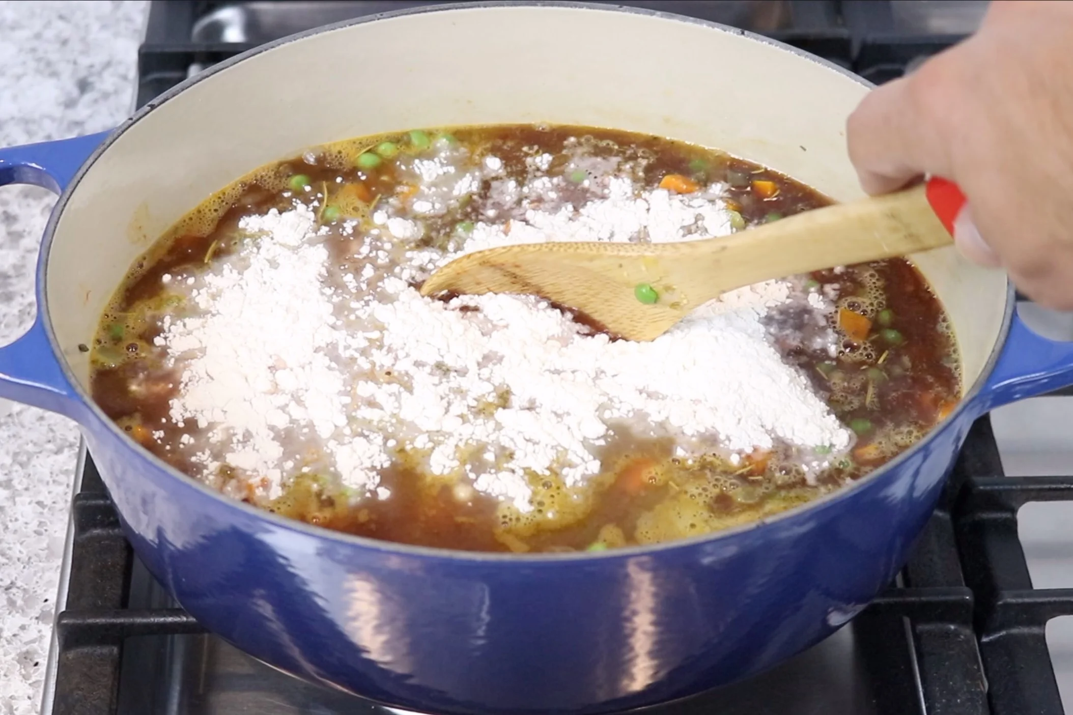 - Stir in the red wine, soy sauce and flour. Bring to a boil once again.