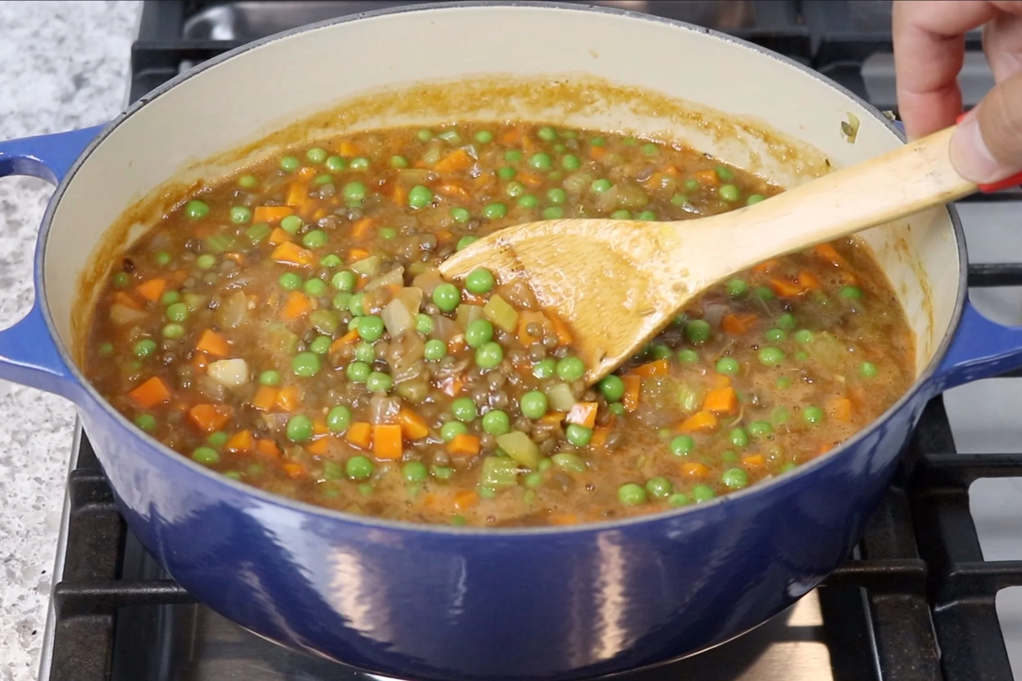 - Add the lentils, peas, tomato paste, veggie broth, rosemary, thyme, salt and pepper. Mix together and bring to a boil over medium high heat.