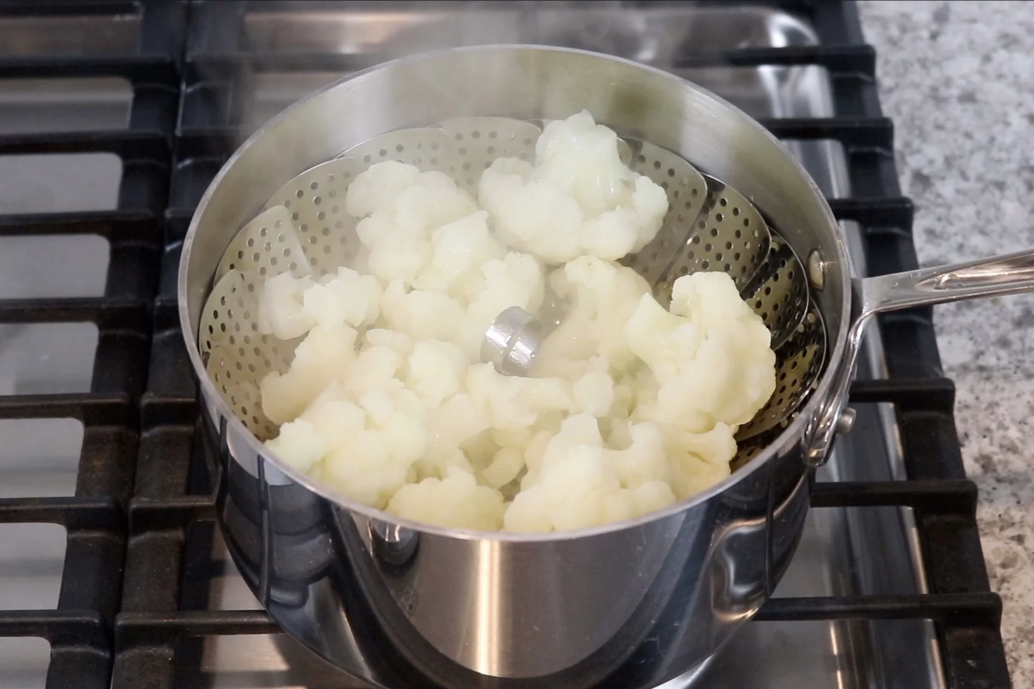 9. Place cauliflower in a steamer basket in a large saucepan filled with a few inches of water. Cover the saucepan and cook on high heat for 15-20 minutes until the cauliflower in really tender.