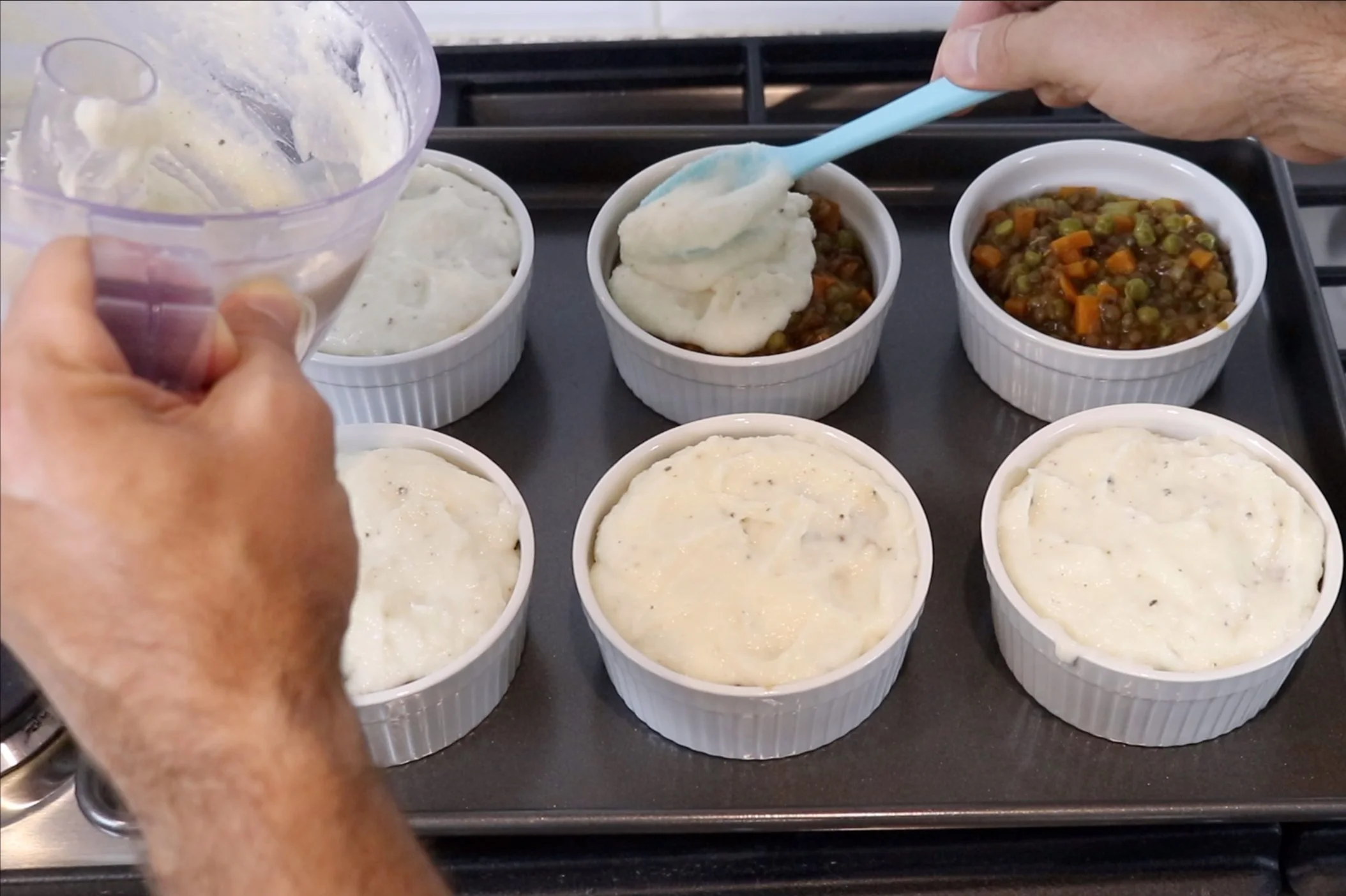 - Fill 6 ten-ounce ramekins 3/4 full with the lentil mixture and top evenly with the mashed cauliflower.