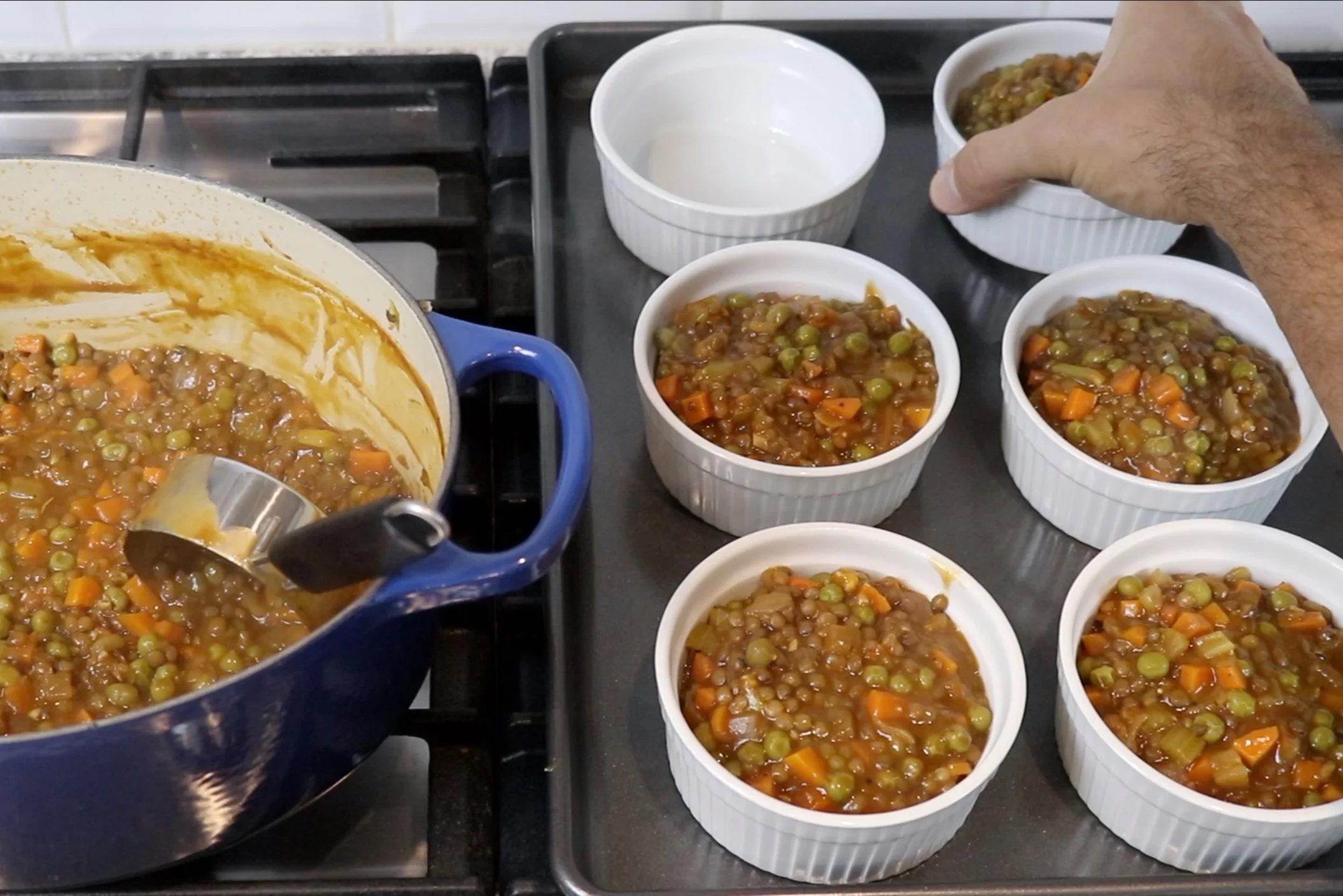 12. Fill 6 ten-ounce ramekins 3/4 full with the lentil mixture.